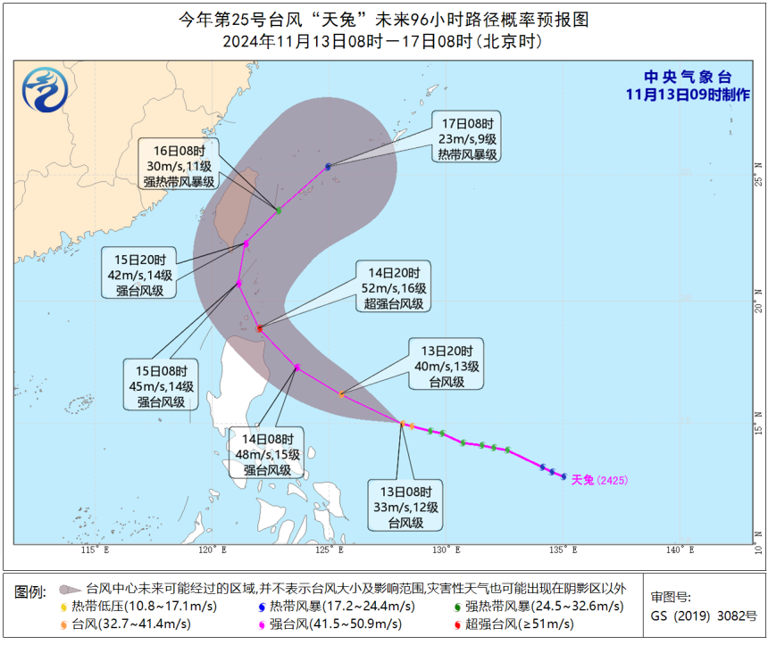 預計,“天兔”將以每小時25-30公里的速度向西偏北方向移動,強度逐漸增強,並向菲律賓以東洋麪靠近。