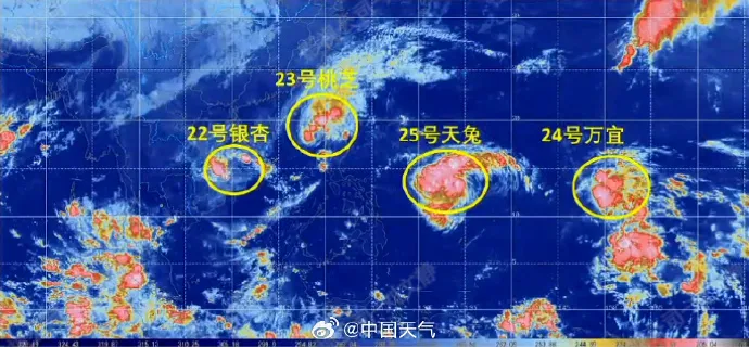 12日凌晨,第25號颱風“天兔”在西北太平洋洋麪上生成,與“銀杏”“桃芝”“萬宜”形成了有氣象記錄以來,11月首次真正意義上的*“四台共舞”。*