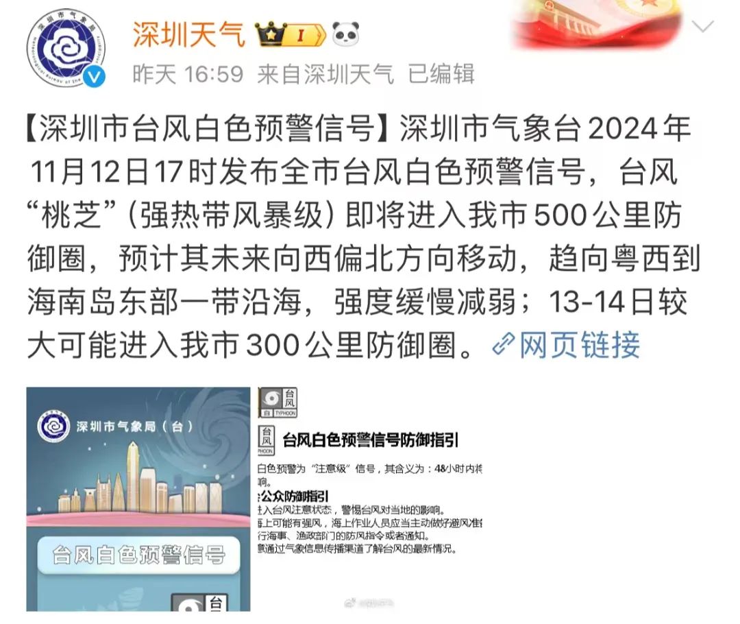 深圳市氣象台2024年11月12日17時發佈全市颱風白色預警信號,颱風“桃芝”(熱帶風暴級)將於今天進入我市300公里防禦圈,然後繼續偏西行,趨向粵西到海南島東部一帶沿海,強度緩慢減弱。