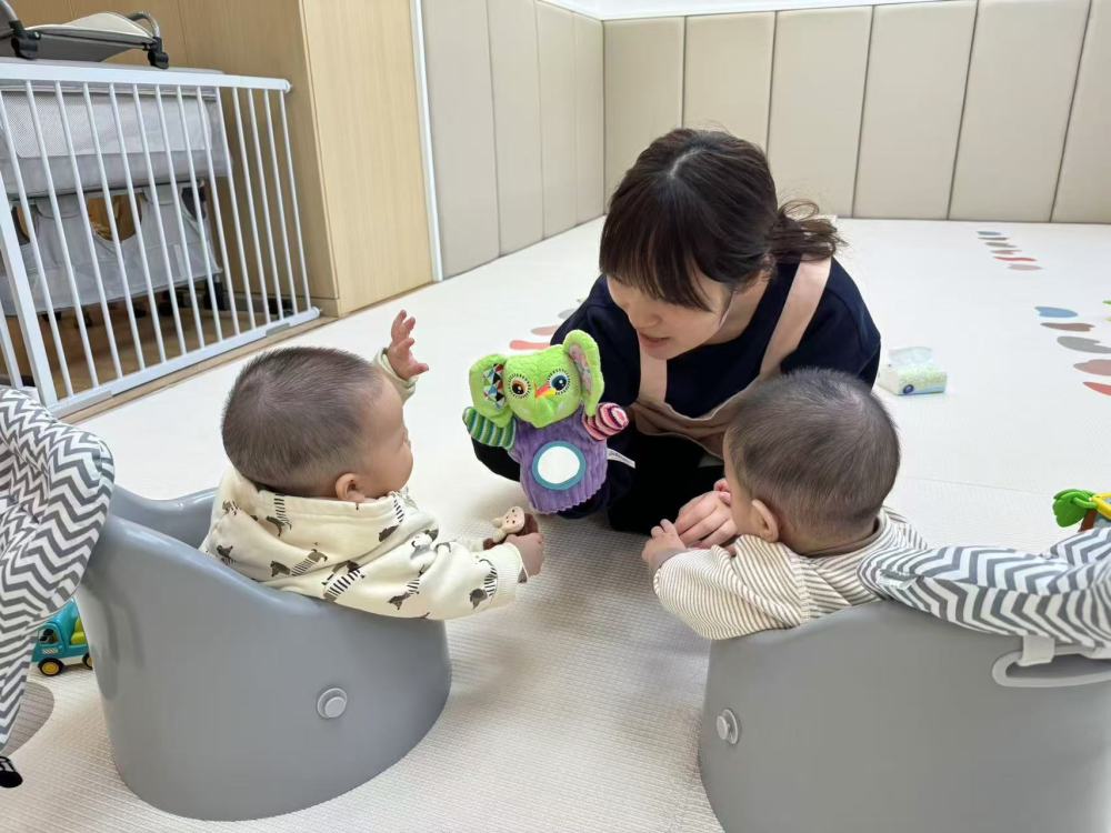 杭州市臨平區優優托育園裏,保育員與乳兒班的孩子一起玩耍。(受訪者供圖)