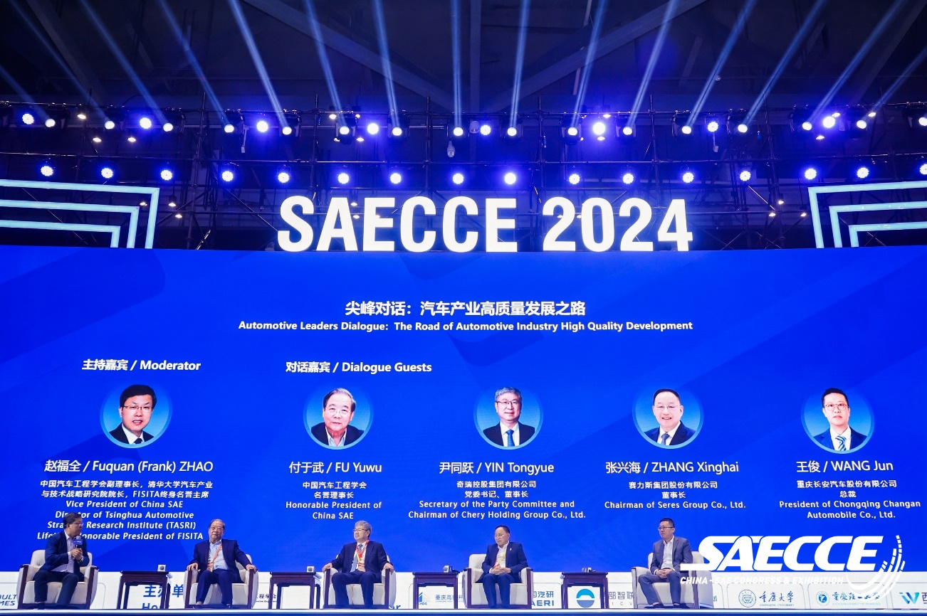 開幕式上,在中國汽車工程學會副理事長趙福全主持的尖峯對話環節,賽力斯集團董事長(創始人)張興海與中國汽車工程學會名譽理事長付於武、奇瑞控股集團有限公司黨委書記、董事長尹同躍,重慶長安汽車股份有限公司總裁王俊一起探討了汽車產業高質量發展之路。