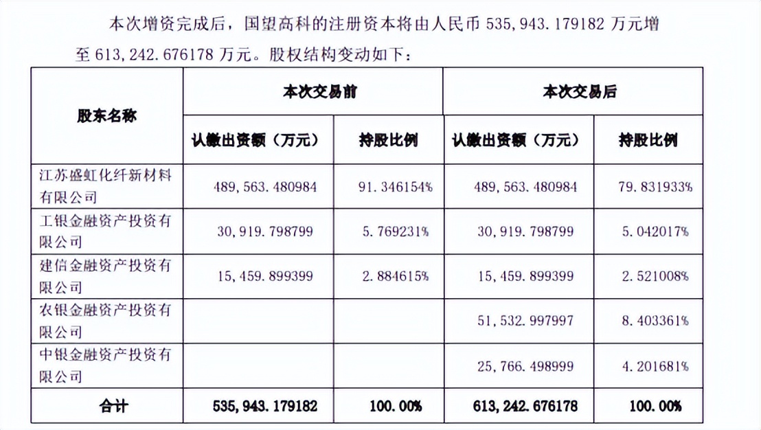 【環球網財經綜合報道】11月11日,東方盛虹(000301.SZ)發佈公告,宣佈其子公司江蘇國望高科纖維有限公司(簡稱“國望高科”)將進行增資擴股,引入工農中建“四大行”旗下的金融資產投資公司——農銀金融資產投資有限公司(簡稱“農銀投資”)和中銀金融資產投資有限公司(簡稱“中銀資產”)作為新股東。此前,國望高科已引入工銀金融資產投資有限公司(簡稱“工銀投資”)和建信金融資產投資有限公司(簡稱“建信投資”)。至此,四大行合計對國望高科增資將達到24億元。