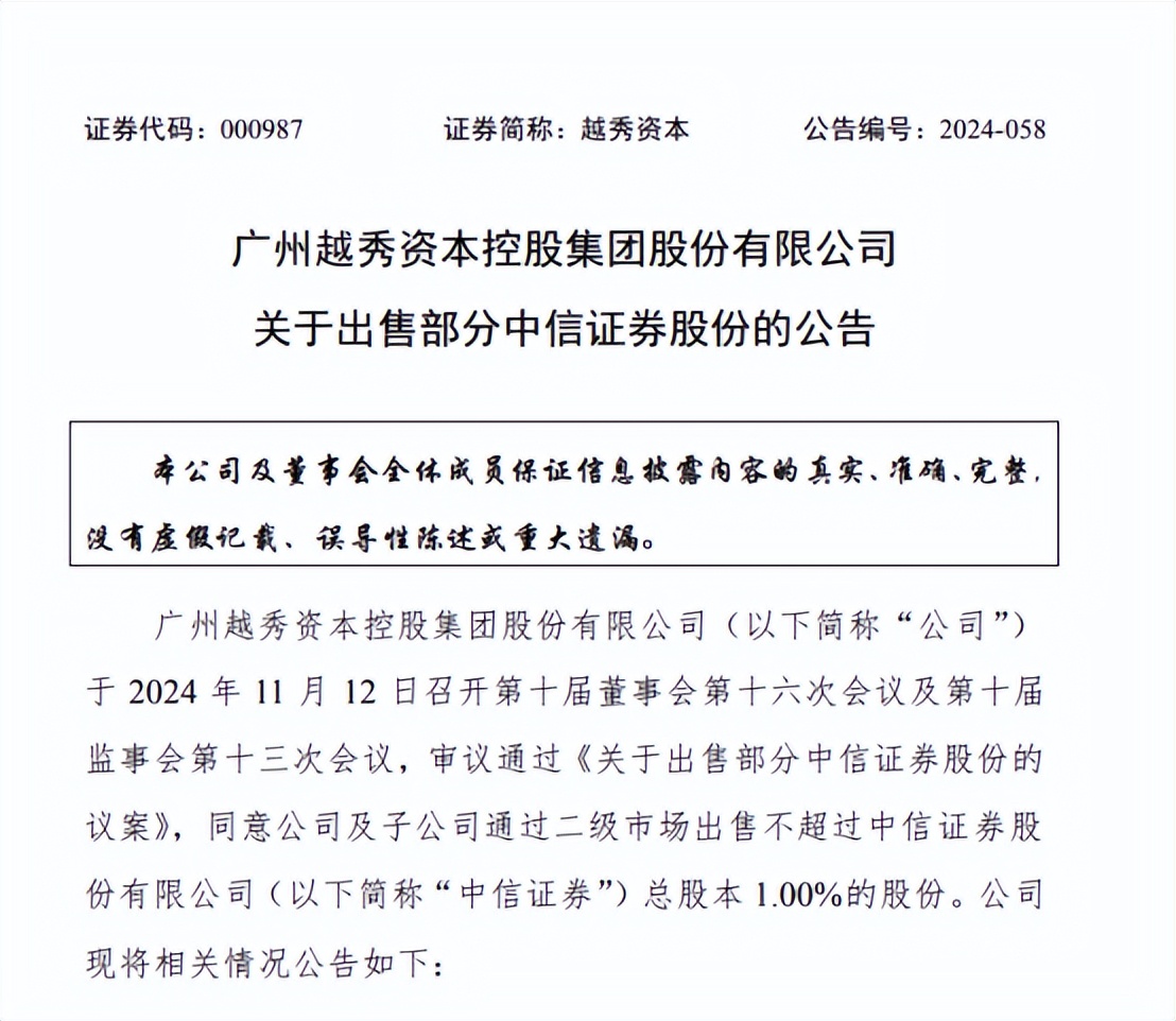【環球網財經綜合報道】11月12日晚間,越秀資本(000987.SZ)發佈公告,宣佈計劃出售不超過中信證券(600030.SH)總股本1.00%的股份。鑑於中信證券當前的最新總市值為4641億元,此次減持若按市值計算,越秀資本或將套現約46.41億元。這一消息立即引起了市場的廣泛關注。