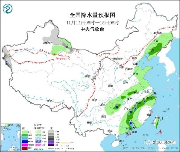 降水預報:13日08時至14日08時,廣東中部和東部偏南地區有中到大雨。