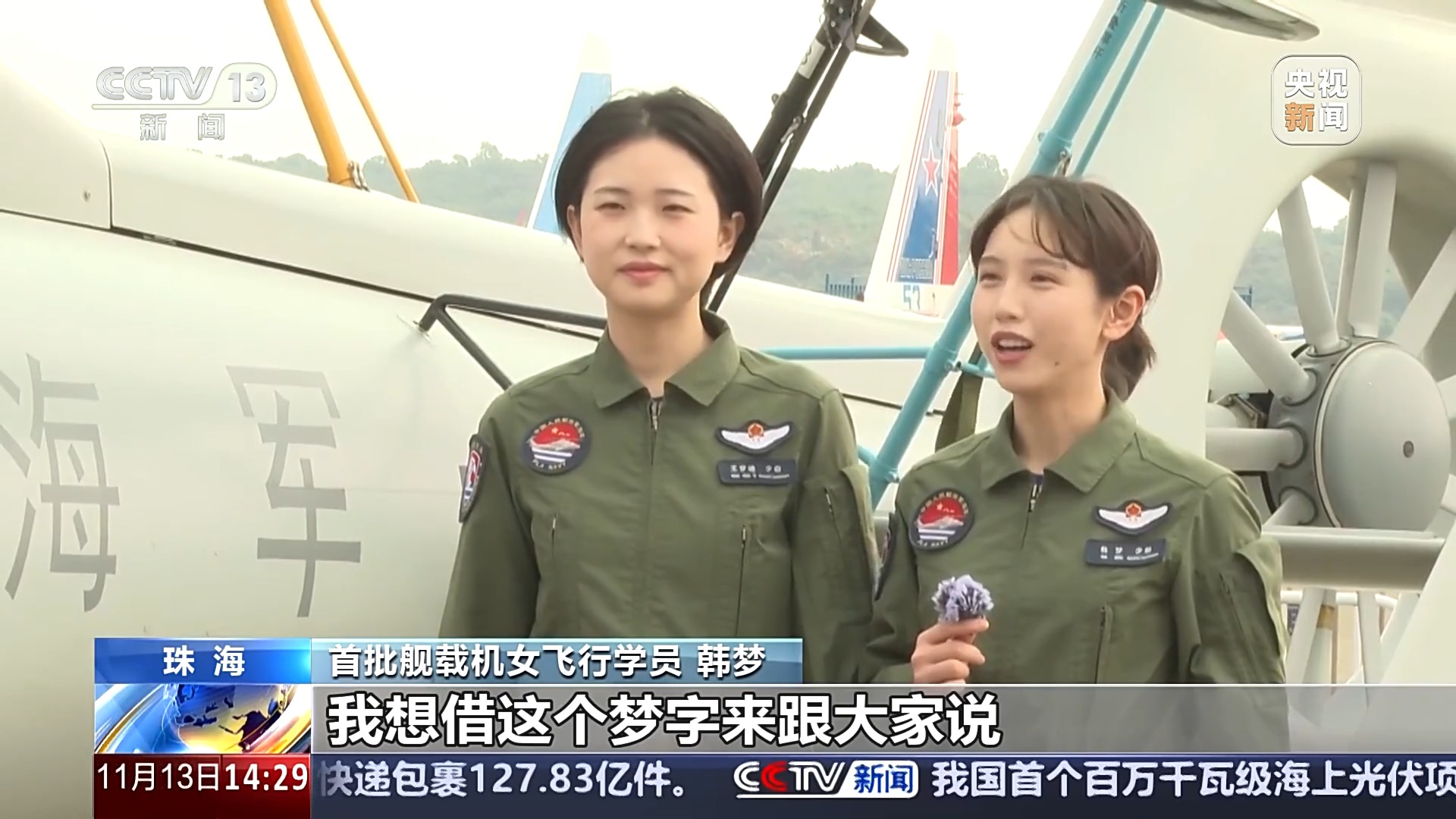 *首批艦載機女飛行學員 韓夢:*我第一次來珠海航展,個人非常激動也非常自豪,在這邊能看到人民海軍亮相了非常多的新型裝備,還有很多的新型戰機,作為一個海軍艦載機飛行學員,未來我也希望能同這些新型戰機並肩作戰,守衞我們國家的萬里海疆。