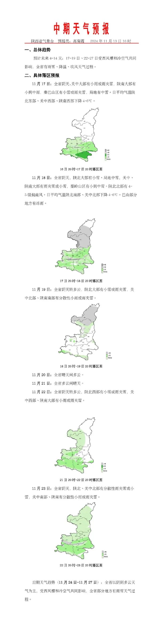 預計未來4-14天:17-19日、22-27日受西風槽和冷空氣共同影響,全省有雨雪、降温、吹風天氣過程。