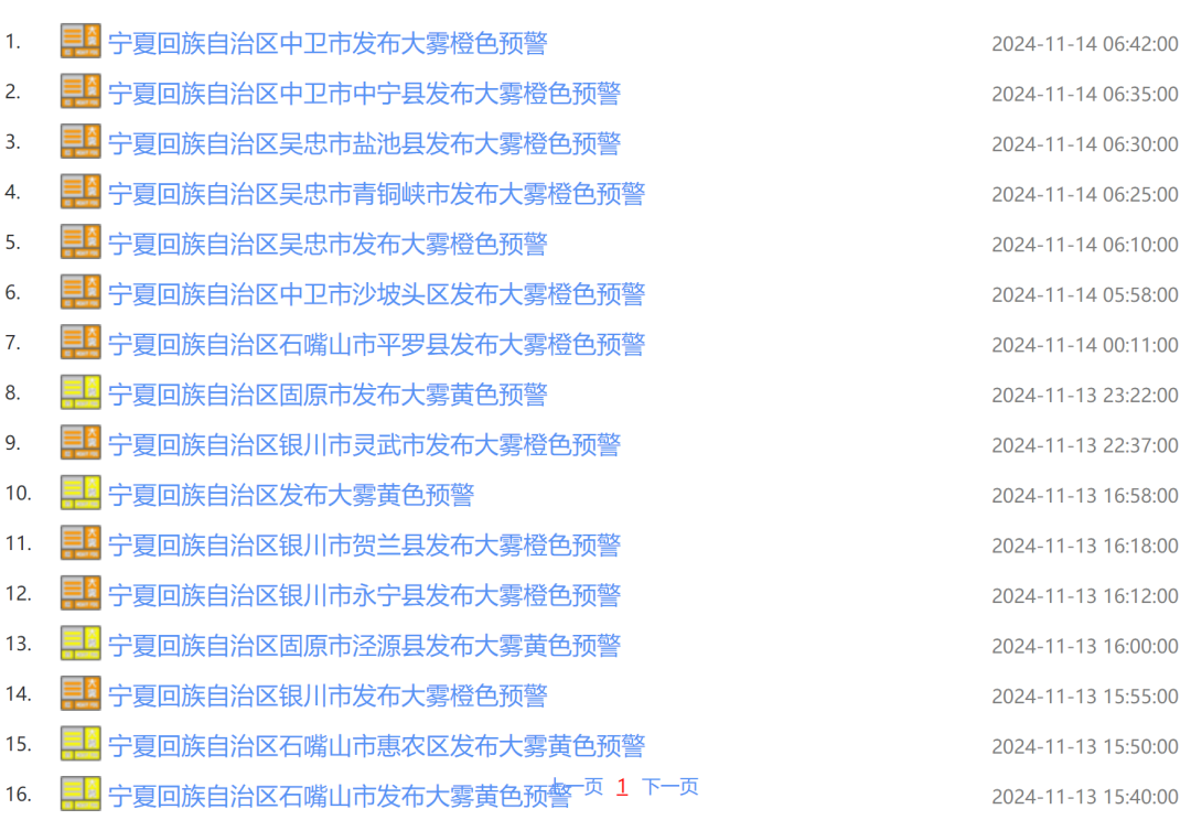 其中,寧夏氣象台於11月13日16時58分發布大霧黃色預警信號。
