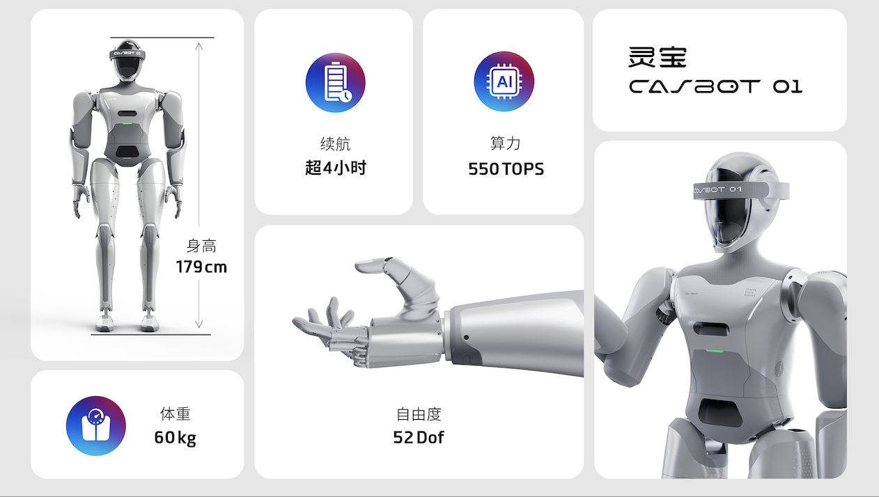 “CASBOT 01”,身高179cm,體重60kg,整機擁有52個自由度,算力達550T,續航時間超過4小時。在機械結構設計部分,經過多次優化,靈寶CASBOT平衡了運動範圍和造型美觀度。在整機極致減重的情況下,採用了高強度金屬材料加工複雜曲面,形成了中間加固的超薄空心腔體,保證了結構的穩定性和抗衝擊性。