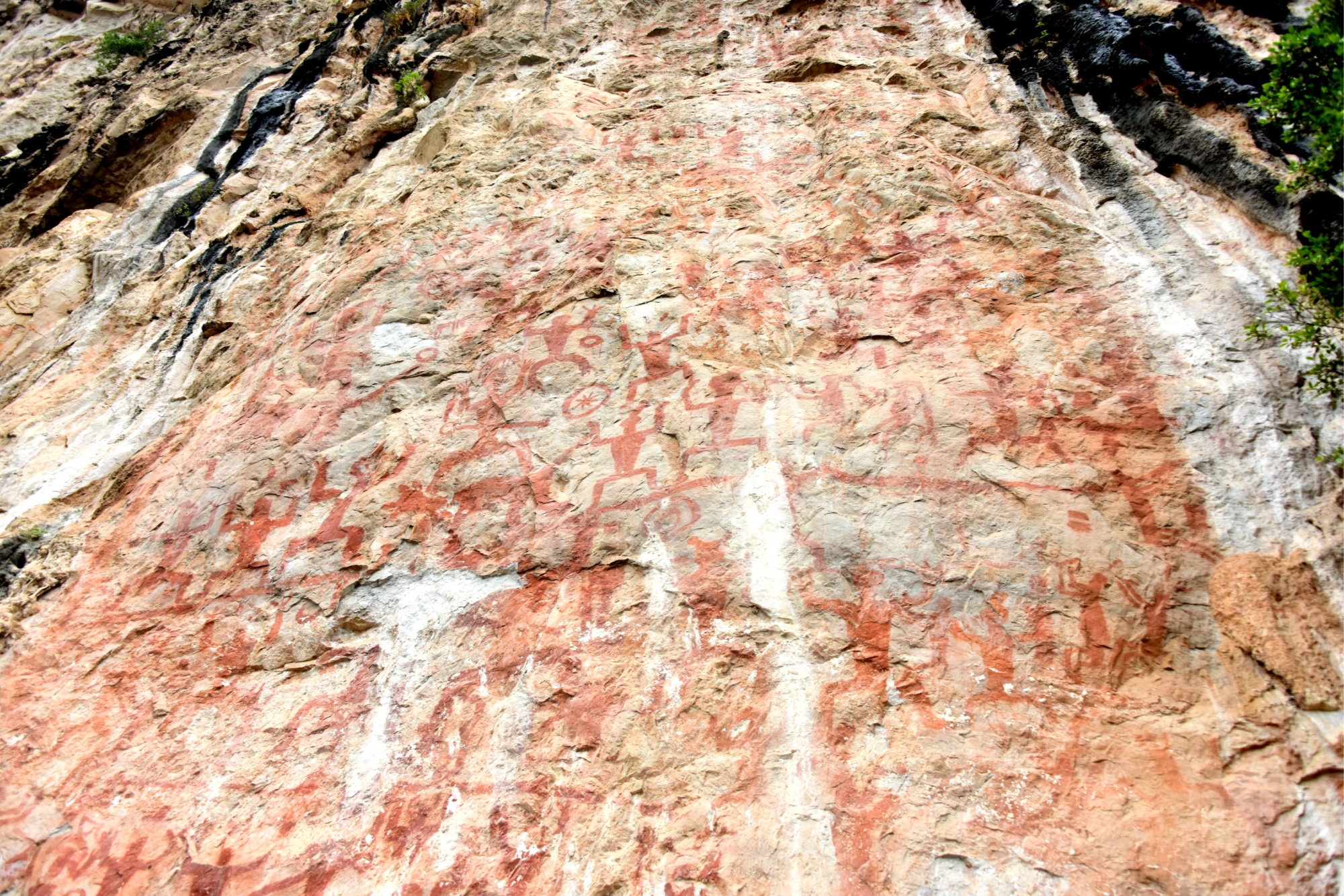 花山,坐落於崇左市寧明縣城西北約25公里的明江河畔,以其古老神奇的巖畫而聞名海內外。花山岩畫距今已有2000多年的歷史,刻着人、獸、銅鼓、刀劍、羊角鈕鍾等造型各異的赭紅色圖像,記錄着壯族先民古駱越人的生活、生產和宗教信仰,為中國首個巖畫類世界文化遺產。