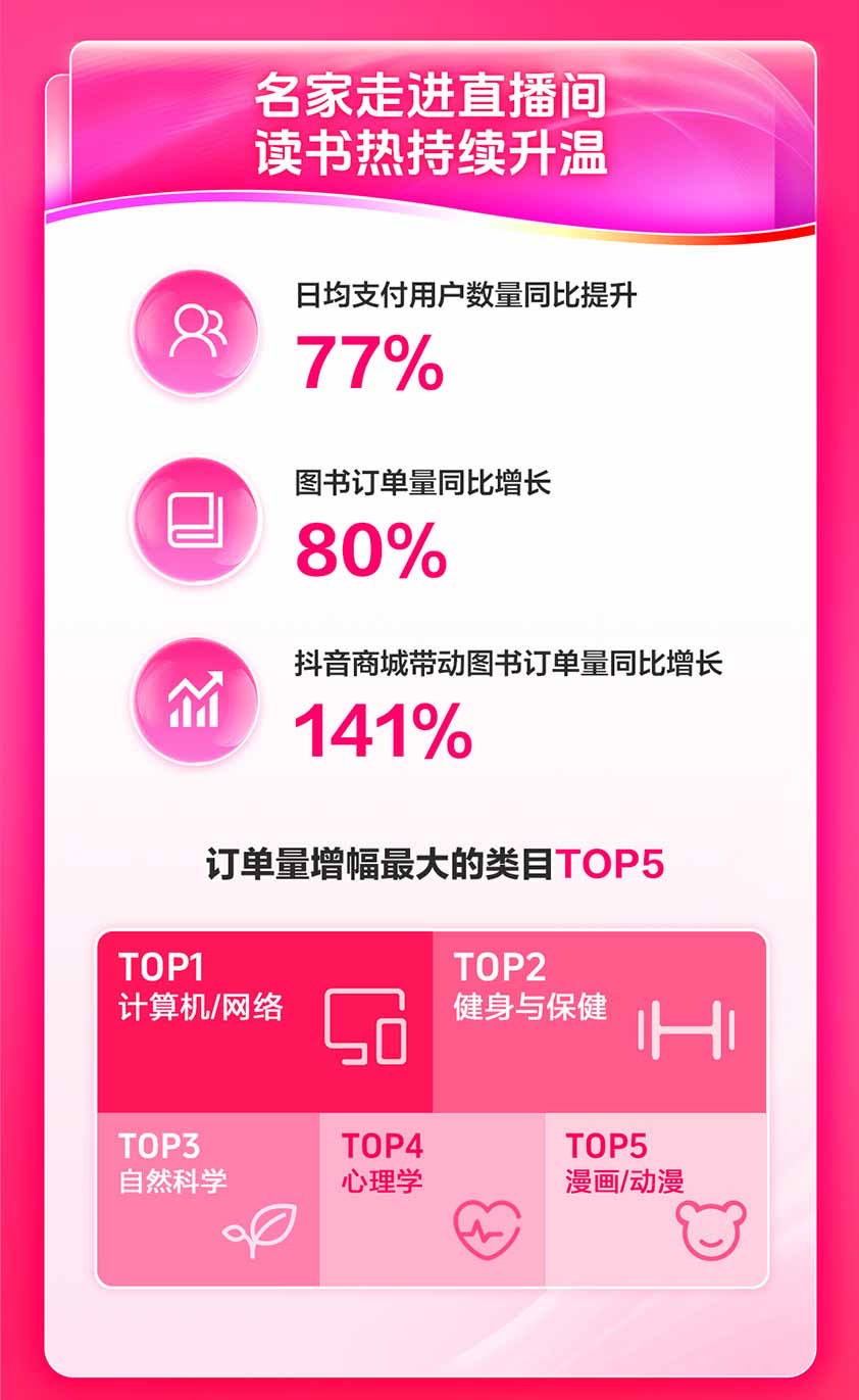隨着全民閲讀深入人心,許多消費者選擇通過短視頻和直播瞭解新書資訊。今年雙11,抖音電商圖書銷售熱度不減,整體銷量同比增長80%。其中,貨架場圖書銷量同比增長達141%。報告顯示,計算機、健身與保健、自然科學、心理學、動漫等五類圖書銷量增幅最大,深受讀者歡迎。