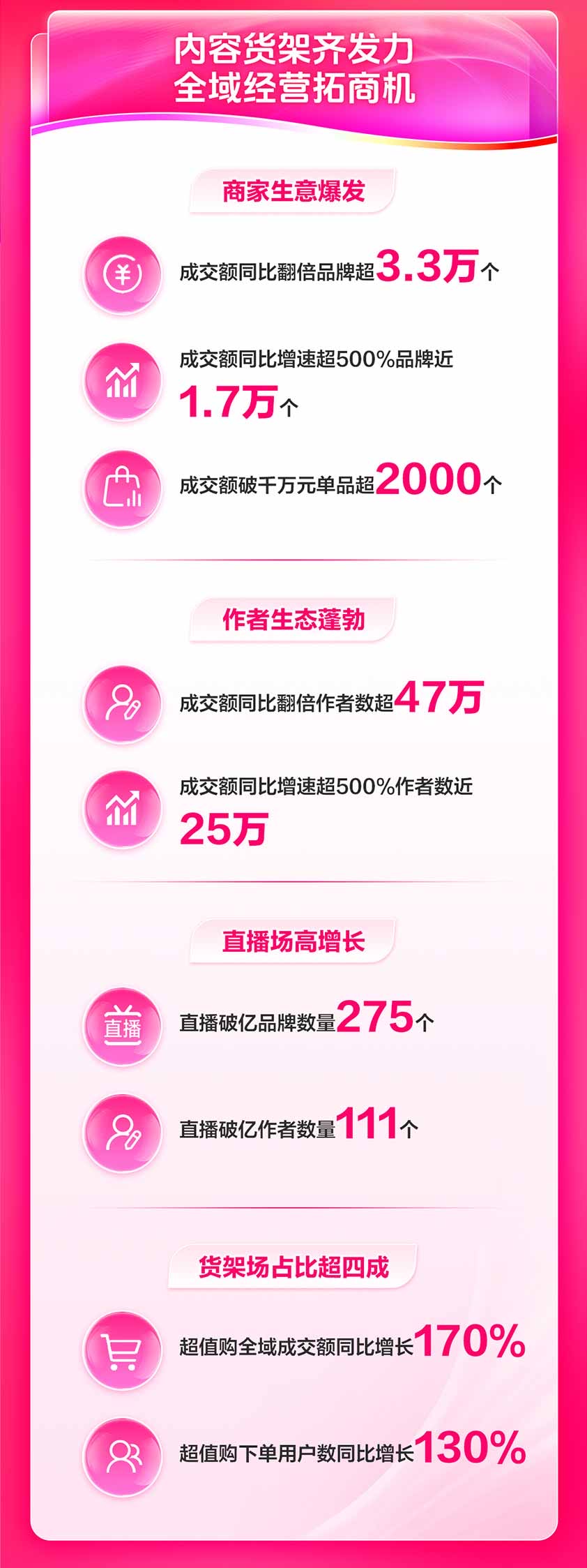 抖音電商相關負責人表示,為滿足消費者日益多元的購物需求,平台將持續通過貨架、直播等全域場景,藉助大促活動提供更多優價好物,進一步激發消費市場活力,同時助力國貨品牌、中小商家、電商達人等不同經營主體在平台內長效發展,找到生意增長的確定性。