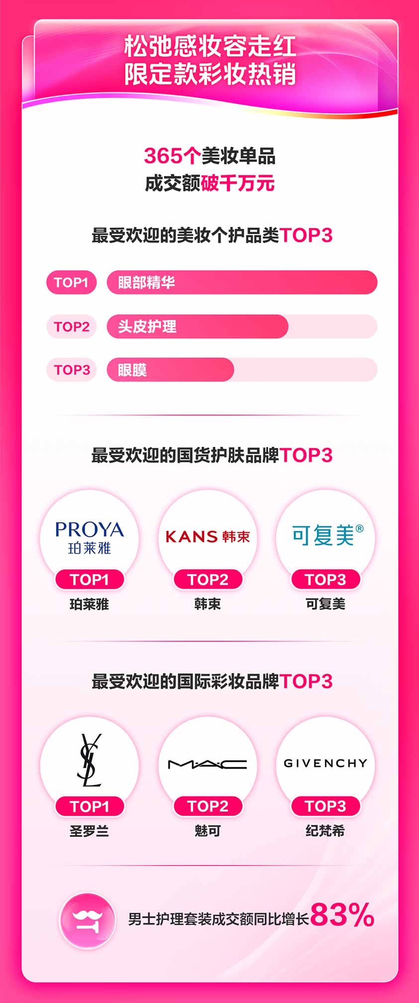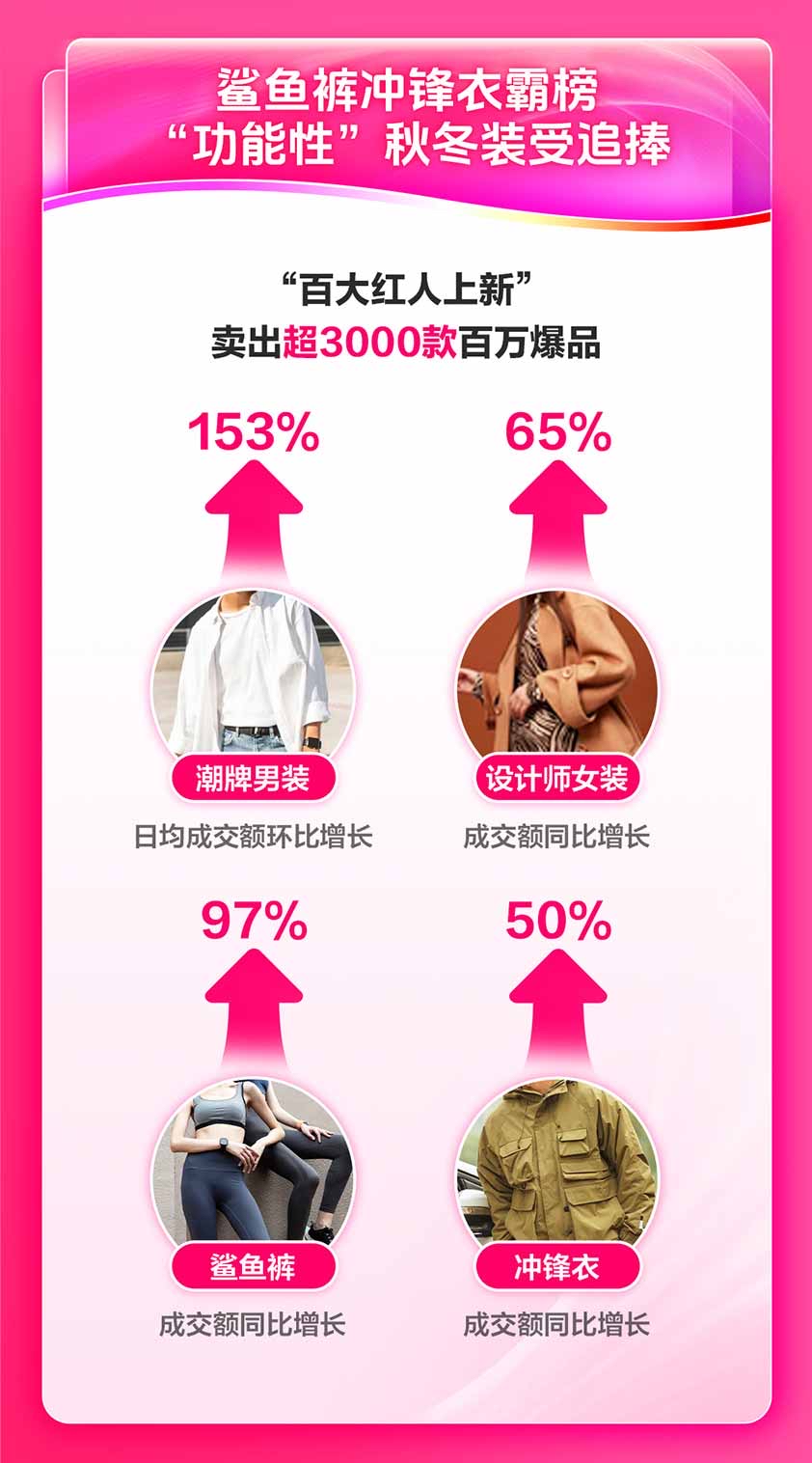 數據顯示,365個美妝單品成交額破千萬元,眼部精華、頭皮護理和眼膜成最受歡迎的美妝個護產品。同時,品牌服飾也在雙11期間銷量暴增,共有116個女裝品牌銷售額增長100%,68個女裝品牌銷售額增長200%。各類鯊魚褲深受女性消費者喜愛,成交額同比增長97%;衝鋒衣領跑户外賽道,590餘款單品成交額破百萬元;潮男們熱衷於通過抖音添置新衣,潮牌男裝日均成交額環比增長153%。