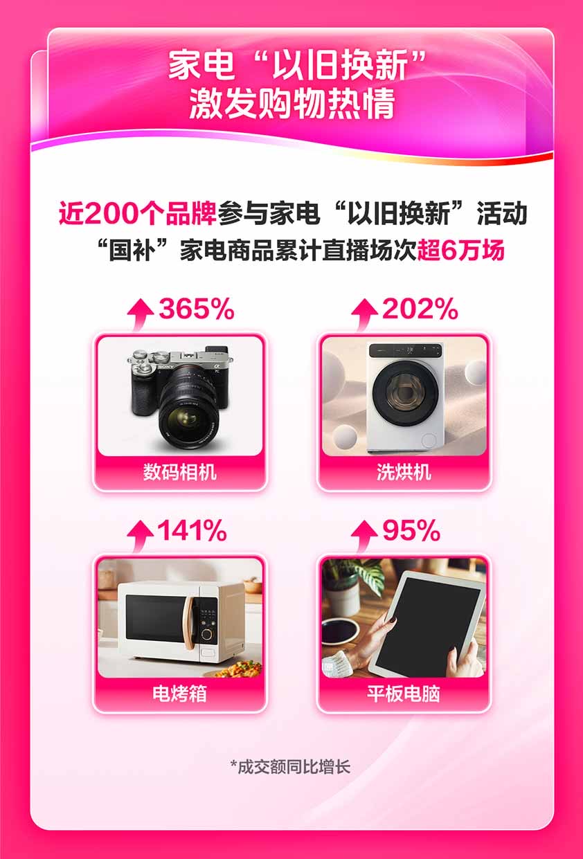 這兩年,追求“質價比”成為越來越多年輕人的共識。適逢國家推出耐用消費品“以舊換新”政策,不少商家抓住“雙11”大促機會,展現出強勁勢頭。期間,抖音電商也宣佈升級家電“以舊換新”服務,設立政府補貼專屬會場,並聯合美的、海爾、格力、小米、聯想等近200個品牌商家參與,平台上“國補”家電商品累計直播場次超6萬場。