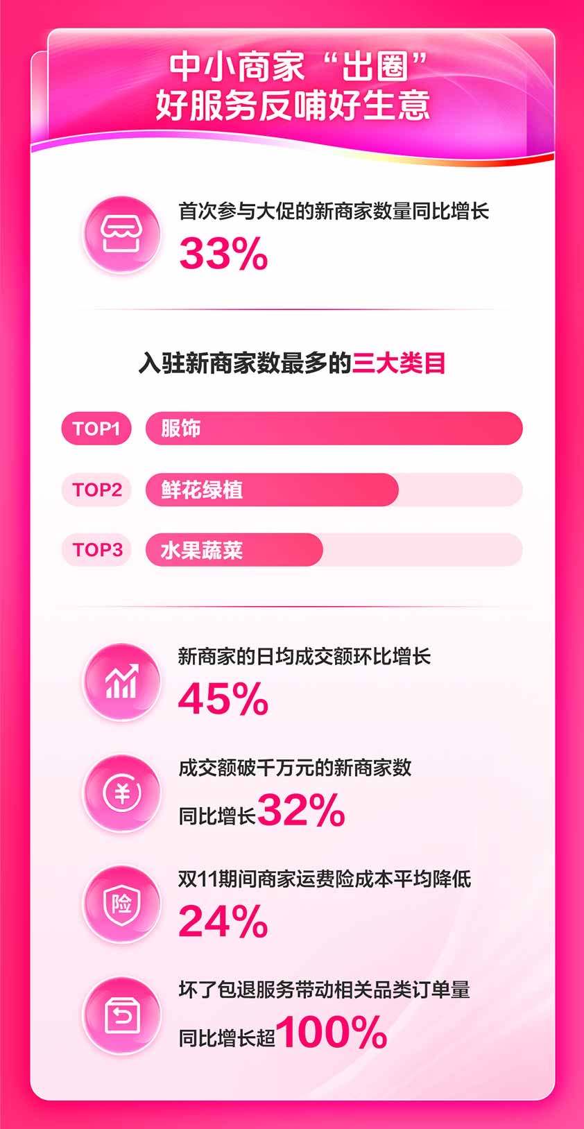 直播電商興起為各地產業帶商家帶來新的發展機遇,截至2023年底,抖音電商已覆蓋全國684個特色產業帶。雙11前後,大批中小商家入駐抖音電商尋找生意機會。報告顯示,首次參與雙11大促的新商家數量較去年同比增長33%,新商家日均銷售額環比增長45%,成交額破千萬元的新商家數量同比增長32%。服飾、鮮花綠植、水果蔬菜是新商家入駐較多的行業。