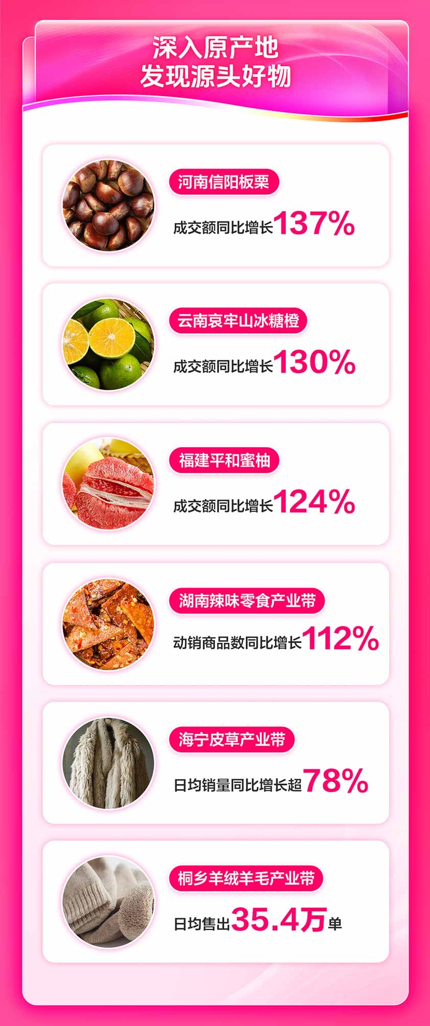 數據顯示,辣條、豆乾等湖南辣味零食成交額同比增長60%,動銷商品數同比增長112%。秋冬來臨,各類保暖服飾進入銷售旺季,海寧皮草產業帶日均銷量增長超78%,日均賣出皮草商品超1.7萬件;桐鄉羊絨羊毛產業帶日均銷量較去年同比增長超40%,日均賣出相關商品超35.4萬單,累計打造超100款銷量破萬單的應季產品。