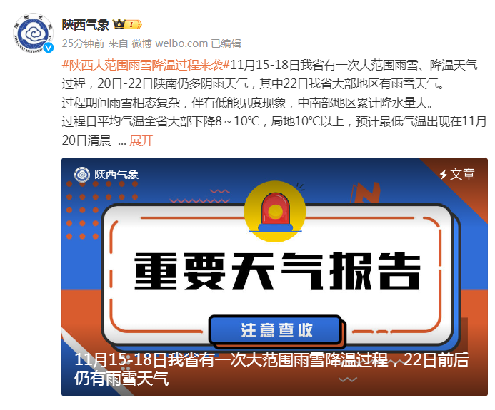 *11月15-18日過程日平均氣温全省大部下降8~10℃,局地10℃以上,預計最低氣温出現在11月20日清晨。*15-16日陝北、關中北部、陝南東部陣風可達6級以上。