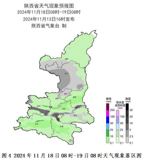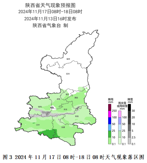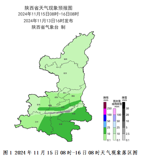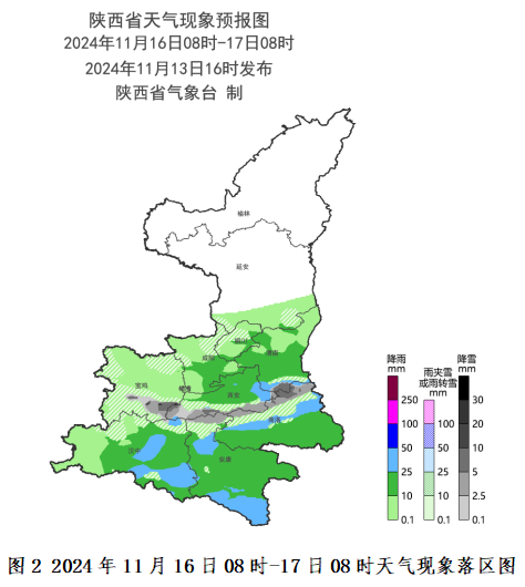 16日關中、陝南西部小到中雨(5-15mm),陝南東部中到大雨(10-30mm),其中關中北部及西部、商洛有雨夾雪或小到中雪(1-4mm),秦巴山區有雨夾雪或大雪(5-10mm)。