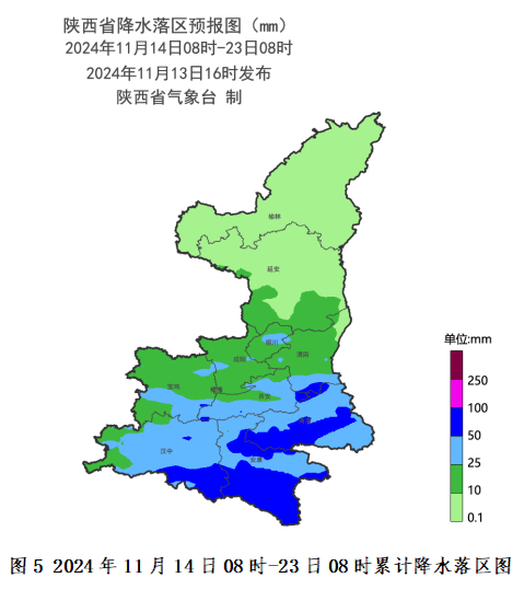 *14日至22日累計降水量:*陝北大部3-15mm、局地可達25mm以上;關中大部10-30mm、局地可達30mm以上;陝南大部25-70mm、局地可達70mm以上。