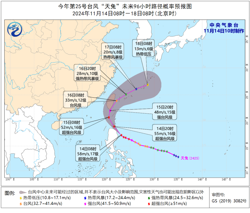 *大風預報:*14日14時至15日14時,巴士海峽、南海北部、廣東中部沿海、福建中北部沿海、台灣島北部沿海將有6-8級大風,陣風8—10級,其中南海西北部及巴士海峽部分海域的風力有9—11級,陣風11—13級,“天兔”中心經過的附近海域風力可達12—16級,陣風14—17級。