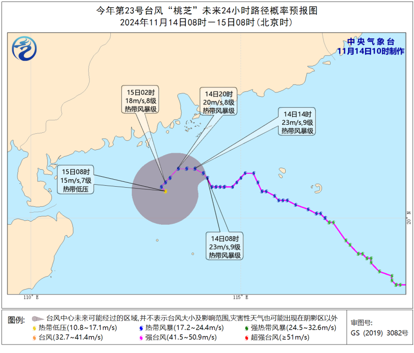 另外,今年*第23號颱風“桃芝”(熱帶風暴級)*的中心今天(14日)上午10點鐘位於香港以南大約145公里的南海北部海面上,中心附近最大風力有9級(23米/秒)。