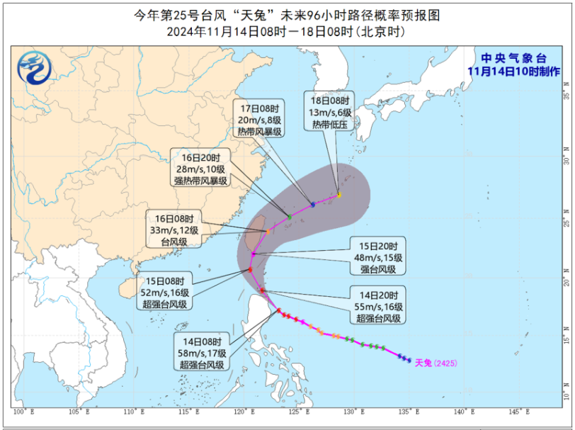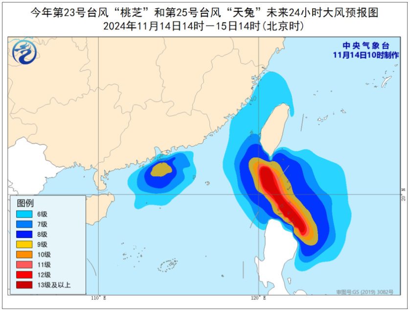 14日14時至15日14時,巴士海峽、南海北部、廣東中部沿海、福建中北部沿海、台灣島北部沿海將有6~8級大風,陣風8~10級,其中南海西北部及巴士海峽部分海域的風力有9~11級,陣風11~13級,“天兔”中心經過的附近海域風力可達12~16級,陣風14~17級。