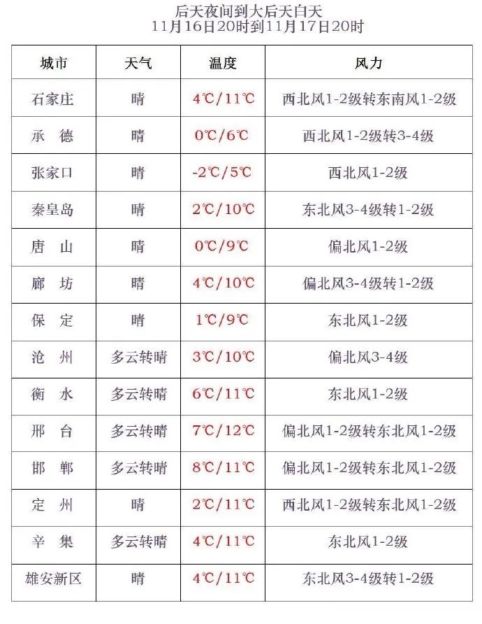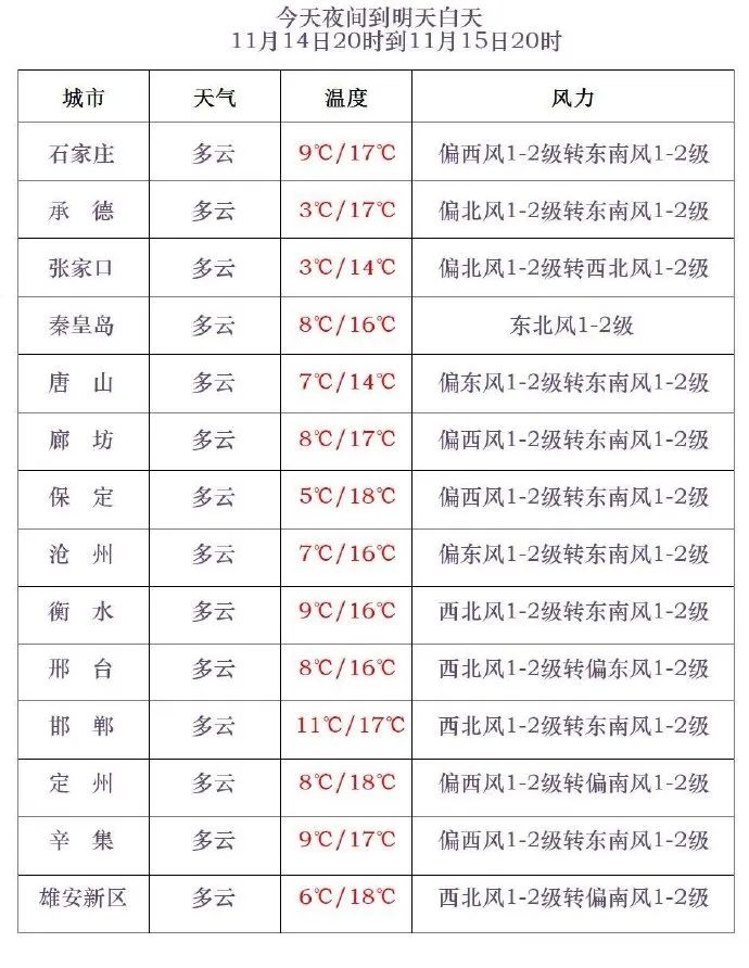 今天傍晚到夜間,全省多雲間晴。今天夜間到明天上午,秦皇島南部、唐山南部、保定東部、雄安新區、廊坊、石家莊東部、滄州、衡水、邢台東部、邯鄲東部有霧。最低氣温,張家口、承德、保定西北部*-6~4℃*,其他地區5~10℃。