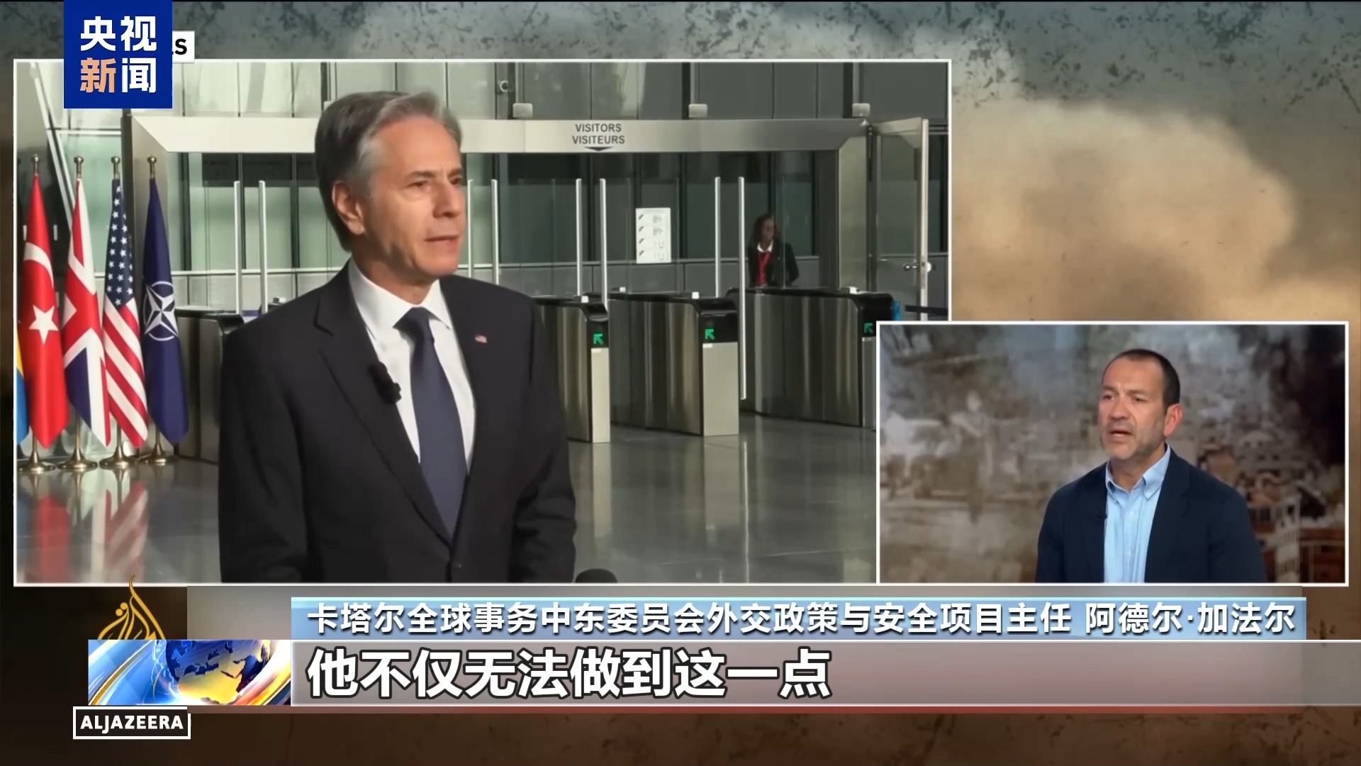 卡塔爾全球事務中東委員會外交政策與安全項目主任 阿德爾·加法爾:過去一年多布林肯已經去了中東至少11次,和中東國家領導人會面,他試圖推動以色列結束戰爭,但到目前為止,他不僅無法做到這一點,而且美國還在外交政策上偏袒以色列,不斷提供武器和資金支持。