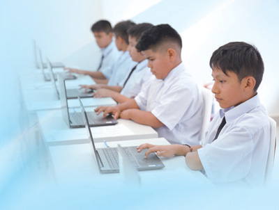 在中企承建的位於秘魯拉利伯塔德大區的哥倫比亞共和國學校內,學生在上計算機課。
