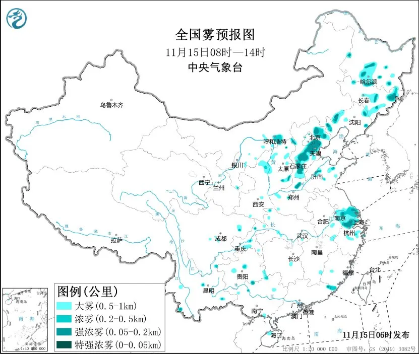 預計,11月15日早晨至上午,北京南部、天津、河北中南部和東北部、山東中部、河南北部、山西中北部、江蘇中南部、*浙江北部、陝西北部、內蒙古中部、遼寧西部、吉林中東部、黑龍江中南部等地的部分地區有大霧,*其中,北京東南部、天津、河北中南部和東北部、河南北部、江蘇南部、*浙江北部、內蒙古中部、遼寧西部、吉林東部、黑龍江南部等地的部分地區有能見度低於500米的濃霧,*天津、河北中南部等地的部分地區有能見度低於200米的強濃霧。