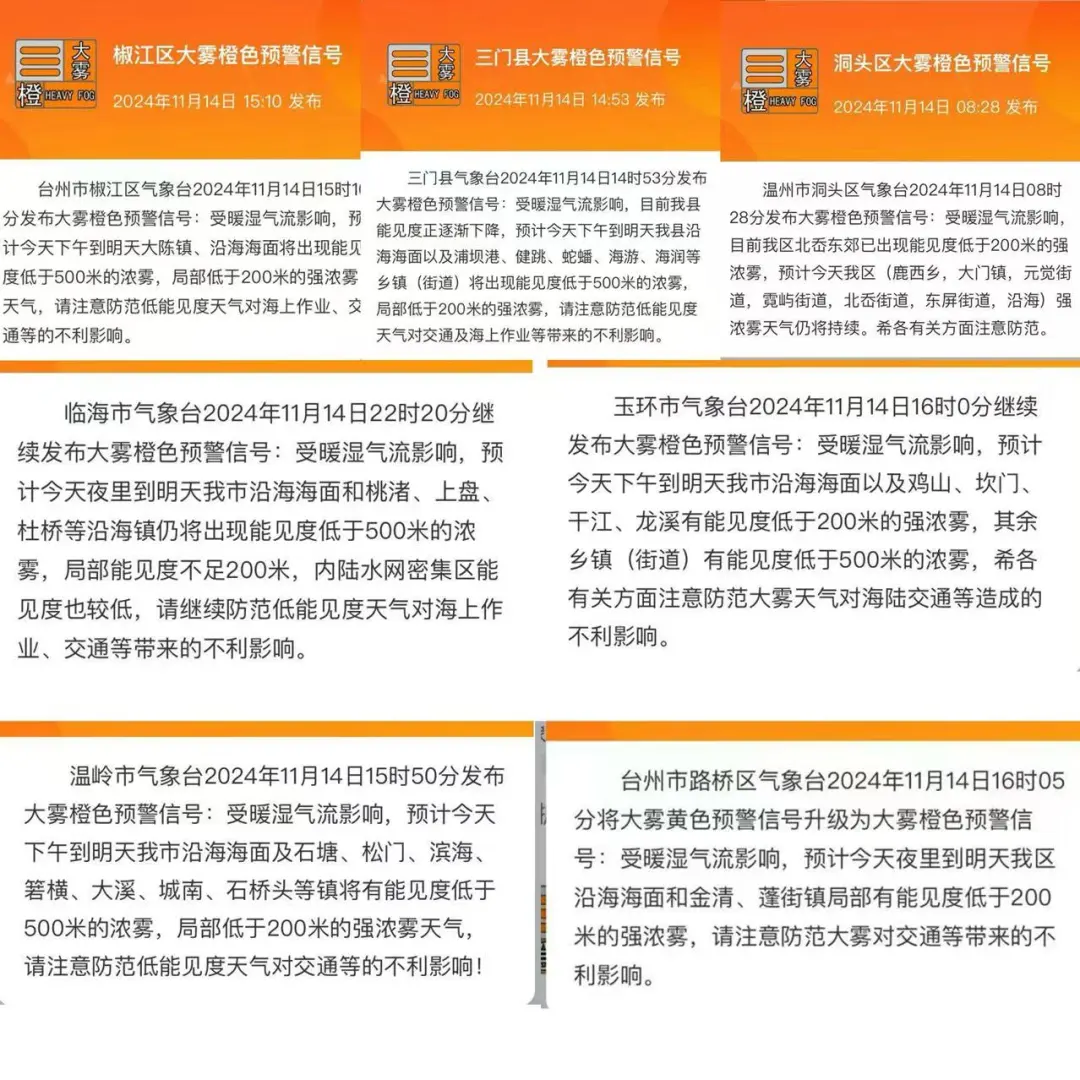 浙江多地出現能見度低於200米的強濃霧,和能見度低於500米的濃霧。