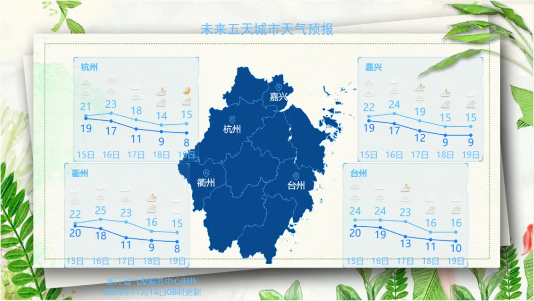 昨天夜裏雨帶逐漸南移,浙中、浙北南部、東南沿海地區成了降雨的核心地帶,需注意防範雷電和短時強降水。今天雨帶繼續南壓,浙南和沿海地區局部有大到暴雨。17日起雨水漸漸收場。