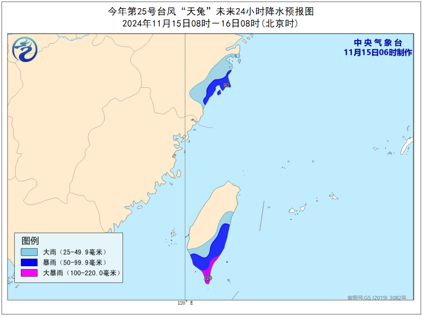*降水**預報:*15日08時至16日08時,浙江東南部、台灣島南部將有大到暴雨,其中台灣島東南部局地有大暴雨(100-220毫米)。