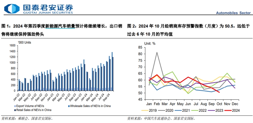 對此國君證券分析認為,汽車市場的強勁銷售表現出對國家汽車報廢更新及“以舊換新”政策的積極響應,黃金週長假刺激了汽車消費,共同推動了乘用車銷售的大幅增長。此外,國內汽車行業“價格戰”趨於穩定,車企降價促銷頻率明顯降低,爆款車型不斷湧現。
