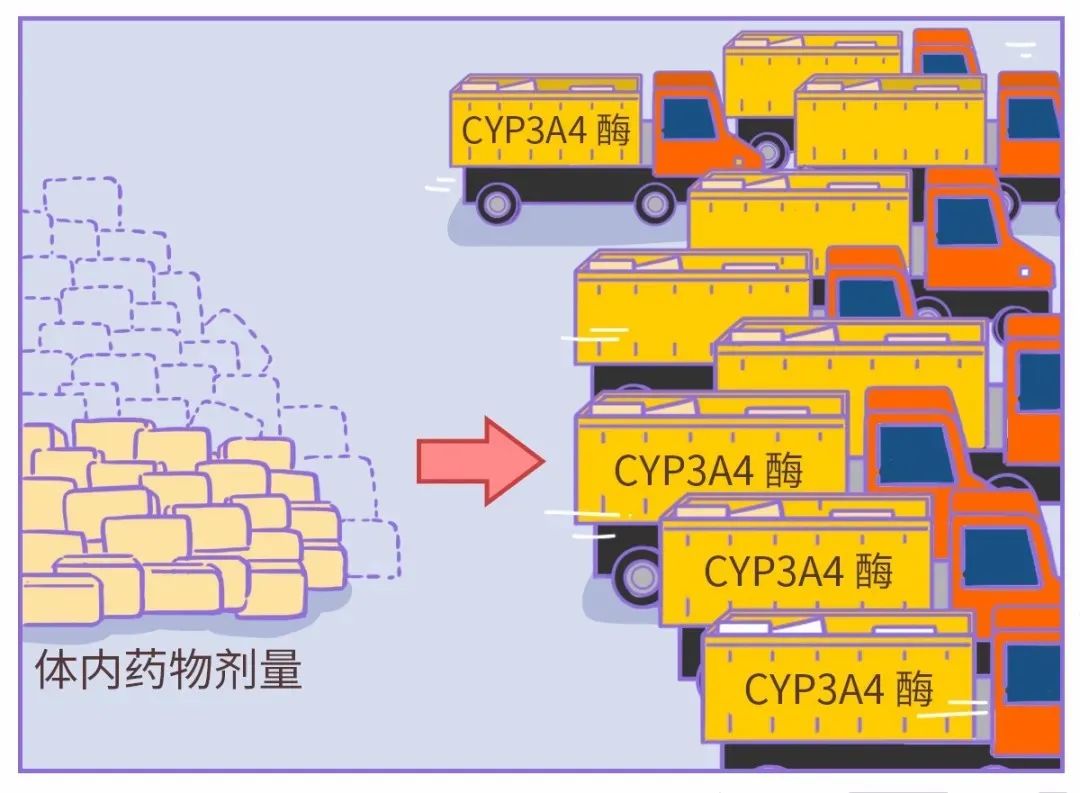 把吃進去的藥想象成一堆貨物,CYP3A4酶就像是貨車,逐漸把貨物運輸到體外,避免貨物在體內大量滯留。