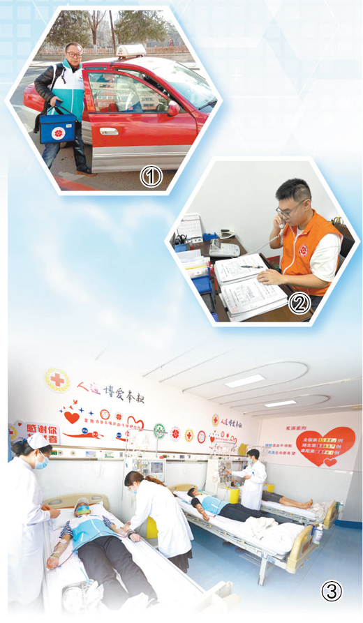 圖③:在湖北襄陽市中心醫院造血幹細胞採集室,3名志願捐獻者正在進行造血幹細胞採集。