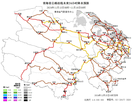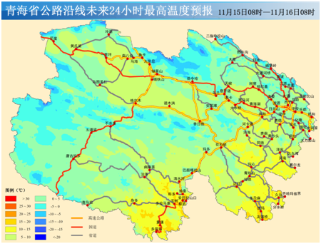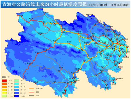 全省天氣形勢:11月15日08時~11月16日08時:今天白天,祁連的部分鄉鎮有中雪(2.5~4毫米),海北大部及大通、天峻、德令哈市的部分鄉鎮有小雪或雨夾雪(0.1~2毫米), 省內其餘地區多雲或晴;今天夜間,海北北部及大通、湟源、互助、天峻、海晏的部分鄉鎮有小雪(0.1~2毫米), 省內其餘地區多雲或晴;北部地區最高氣温將下降4~6℃,局地可達8℃以上;柴達木盆地、青海湖流域有5~6級西北風,陣風可達8級以上。