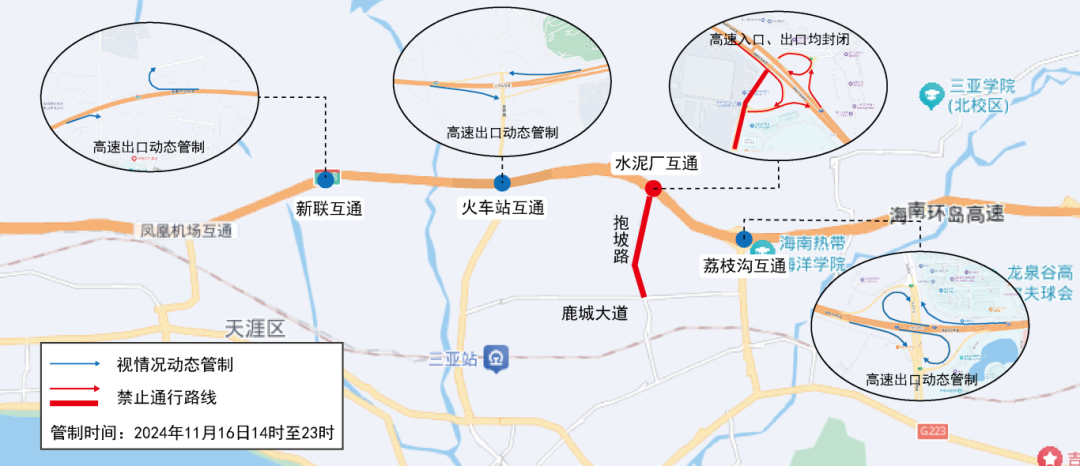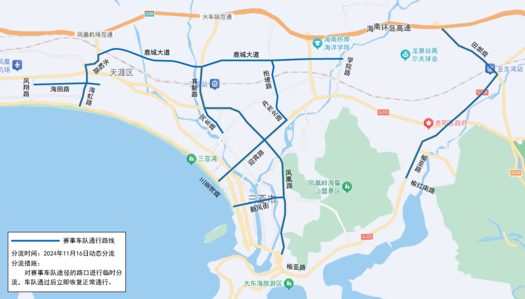 值得注意的是,11月16日14時起,賽事車隊途經以下路段交通路口時,對路口進行動態臨時分流,保障賽事車隊優先通行,車隊通過後立即恢復正常通行:河東路(金雞嶺路至鳳凰路)、育新路、鹿城大道(水蛟路至學院路)、鳳凰路(育新路至榆亞路)、榆亞路(榆紅南路至吉陽大道)、田獨路(吉陽大道至G98高速)、迎賓路(三亞灣路至丹州北路)、抱坡路、丹州北路、吉陽大道、新風街、水蛟路、海虹路、海田路全段。