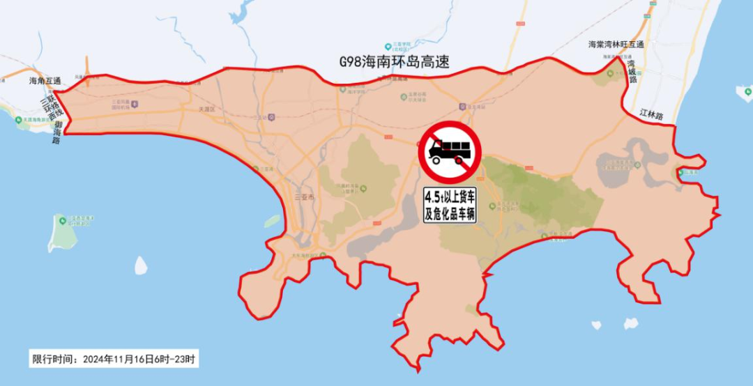 11月16日6時至23時,東起江林路—灣坡路,西至三環西聯絡線—御海路,北至G98高速(含),南至海邊道路所包含區域內的道路,限制4.5噸以上貨車、危化品車輛通行。