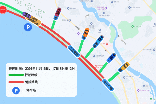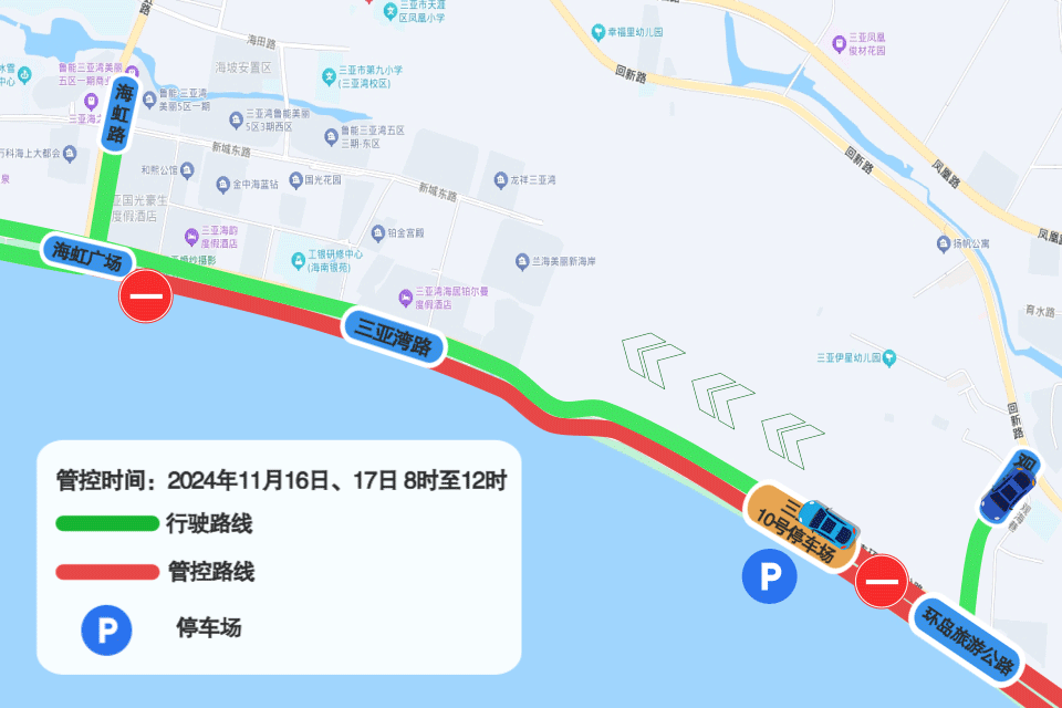 11月16日8時至12時,三亞灣路海虹廣場至三亞灣10號停車場路段將分時、分段實行半幅單向交通管制,管制由海虹廣場往海月廣場方向半幅道路;