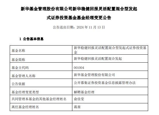 根據公告,蔣茜卸任後,新華優選成長由賴慶鑫管理,新華鑫益由賴慶鑫、張大江共同管理,新華穩健回報基金經理為俞佳瑩。