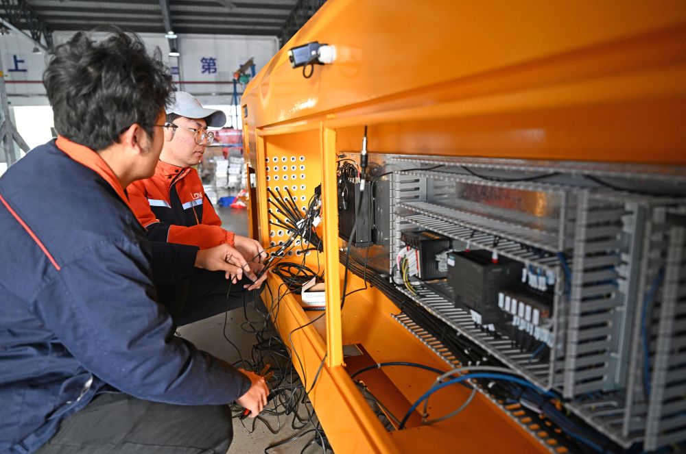 在位於天津市西青區的天津朗譽機器人有限公司生產車間內,工作人員在調試重載自動導引運輸車。新華社記者 趙子碩 攝