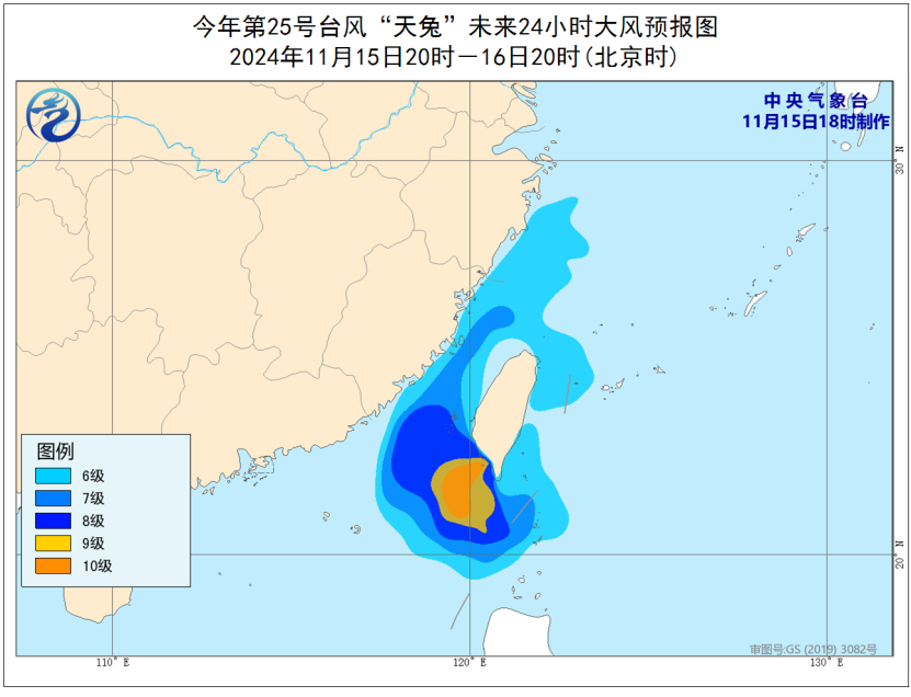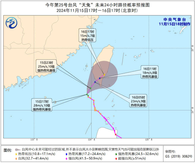 中央氣象台11月15日18時繼續發佈颱風藍色預警: