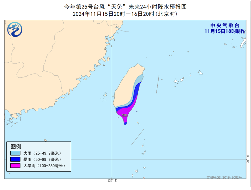 *降水**預報:*15日20時至16日20時,台灣島東部和南部將有大到暴雨,部分地區有大暴雨(100-230毫米)。