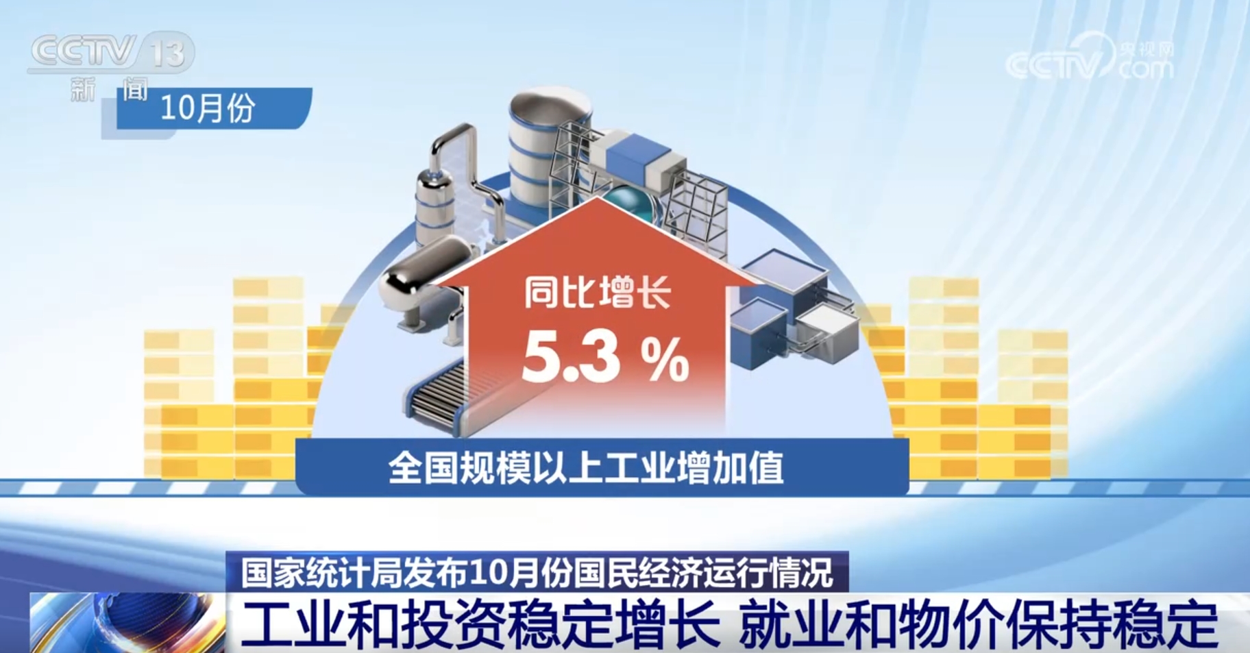 再説“兩個穩定”,一是工業和投資穩定增長,二是指就業和物價保持穩定。從工業來看,在大規模的設備更新以及產業升級發展等因素驅動下,10月份規模以上工業增加值同比增長5.3%,繼續保持較快增長,其中製造業升級發展態勢明顯。