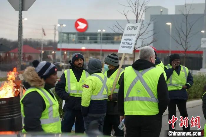 當地時間11月15日,加拿大多倫多,罷工的加拿大郵政工人在一處郵件處理中心外設立罷工糾察線。在持續一年的勞資談判終告破裂後,加拿大郵政工人工會自當日起展開全國大罷工。中新社記者 餘瑞冬 攝
