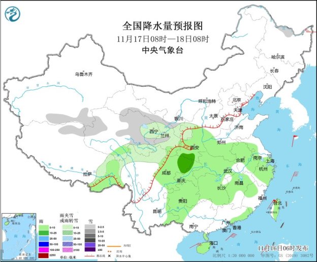 此外,今天白天到夜間,內蒙古東北部、黑龍江東部、吉林中東部及青海東部和南部、甘肅中東部和南部、川西高原北部等地部分地區有小到中雪或雨夾雪;陝西中南部、河南南部、安徽中西部、四川盆地東部、重慶大部、湖北西部、貴州北部等地部分地區有中到大雨。