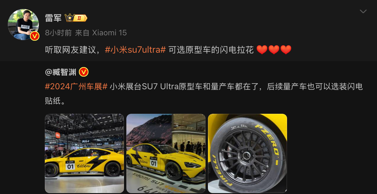 面對消費者對小米SU7 Ultra量產版的期待,小米董事長兼CEO雷軍在社交平台上表示,聽取網友建議,小米SU7 Ultra量產版將可選原型車的閃電拉花設計。