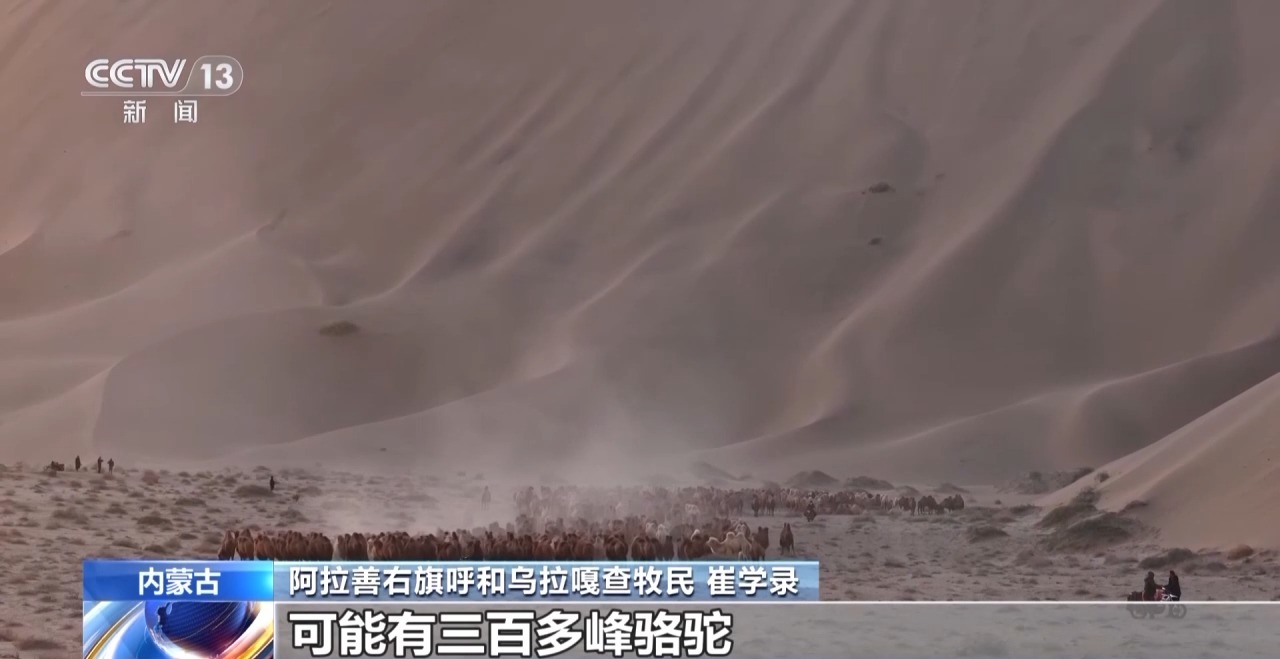 *阿拉善右旗呼和烏拉嘎查牧民 崔學錄:*這次收了三百多峯駱駝,停個十來天,還得進來收第二批,可能有三百多峯駱駝。