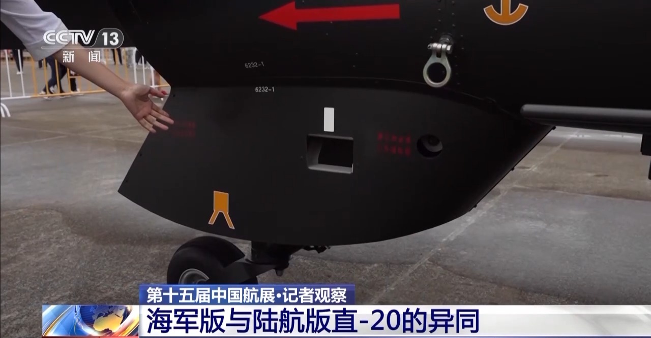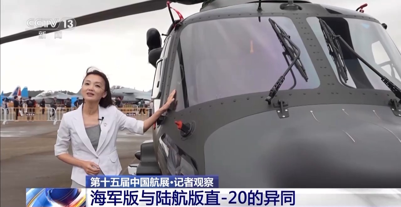 *總枱央視記者 於立羣:*從整體看,陸航版和海軍版的直-20並沒有特別大的區別,整體流線型設計非常亮眼,這種設計可以有效降低飛行阻力,提高飛行效率。