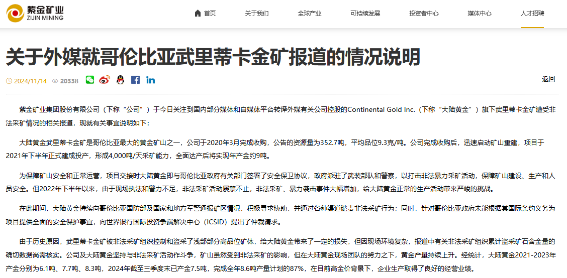 紫金礦業哥倫比亞金礦遭遇非法採礦,損失超3噸黃金,公司積極應對併發起仲裁